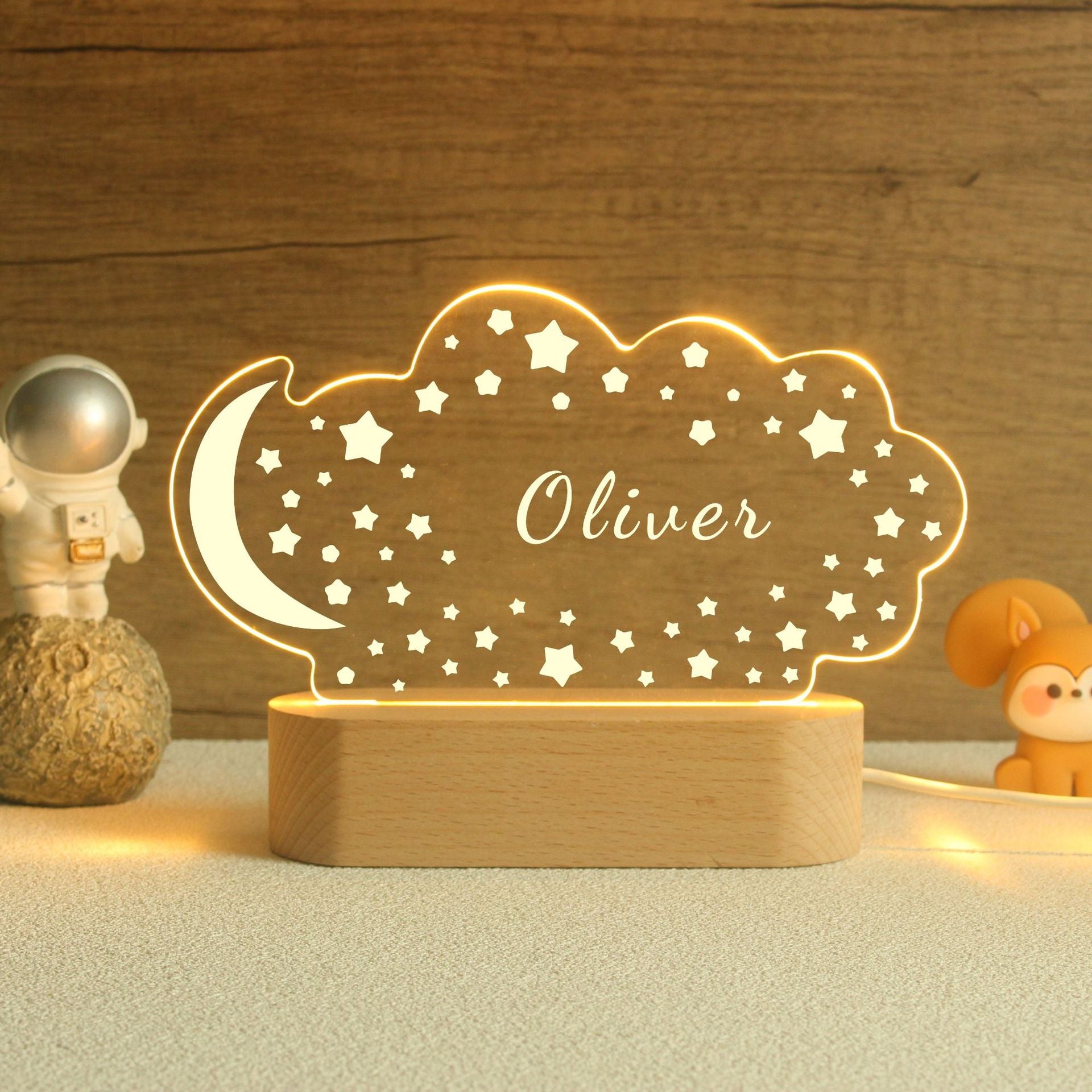 This personalised cloud night light features your child’s name softly illuminated among stars and a gentle moon. The warm LED glow creates a calm, comforting atmosphere that helps little ones feel safe and relaxed at bedtime.